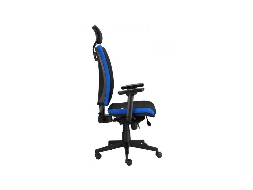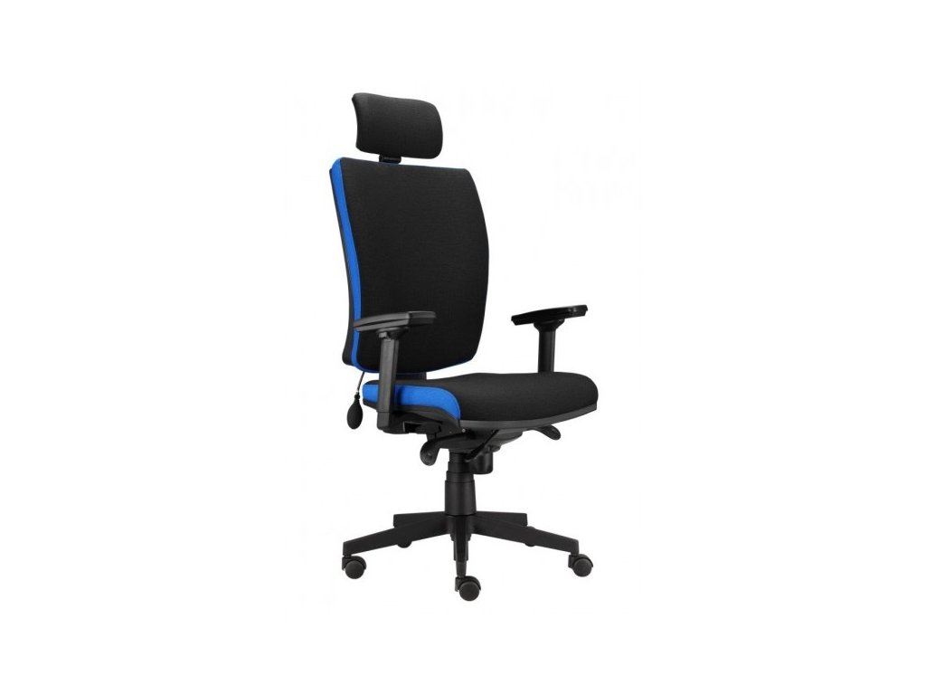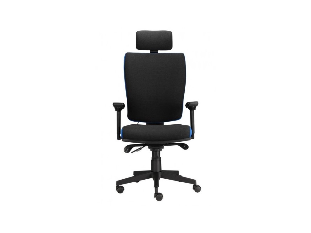 Moderní kancelářská židle, možnost přidání stavitelného podhlavníku a vzduchové bederní opěrky. Hmotnost 15,9 kg. Šířka sedáku 50 cm.